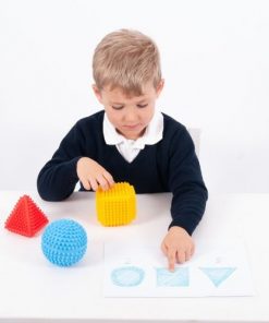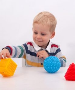 Set met 3 grote kleurrijke tactiele 3D-vormen met een zacht verhoogd textuuroppervlak, ideaal voor vroege sensorische verkenning en voor jonge kinderen om de kenmerken van een bol, piramide en kubus te ontdekken.