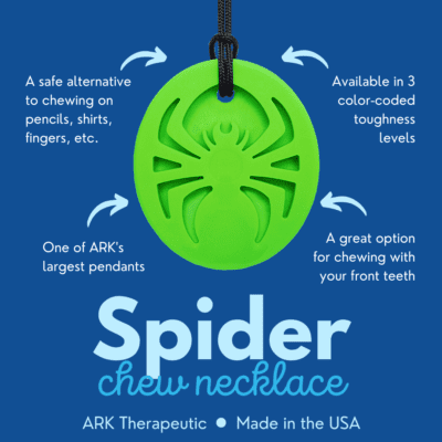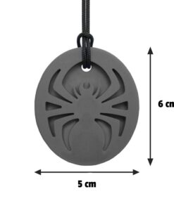De ARK’s Spider Bite kauwketting is een stoere ketting, met op de voorkant een spin (verlaagd) en een gladde achterkant. De spider is een van de grootste hangers en is 6 cm lang, 5 cm breed en 1 cm dik wat hem geschikt maakt voor kinderen die de voorkeur hebben met de voortanden te kauwen. Gebruik hem als veilig alternatief voor het kauwen op potloden, shirts, vingers, enz. En om je te helpen met kalmeren, concentreren en spanningen te reguleren.