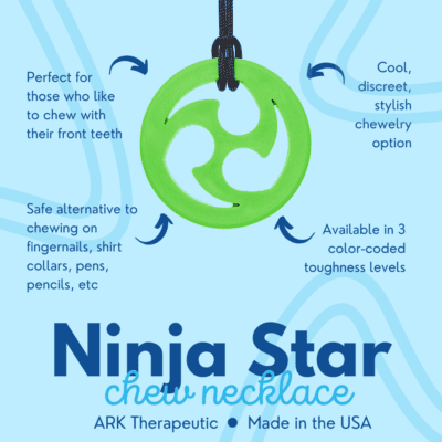 De ARK’s Ninja Star kauwketting is een super stoere ketting voor kinderen en volwassenen met de behoefte ergens op te kauwen. De Ninja Star is ongeveer 5 cm diameter en 1 cm dik. Gebruik hem als veilig alternatief voor het kauwen op potloden, shirts, vingers, enz. En om je te helpen met kalmeren, concentreren en spanningen te reguleren.