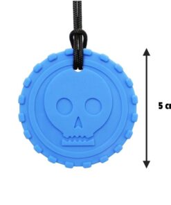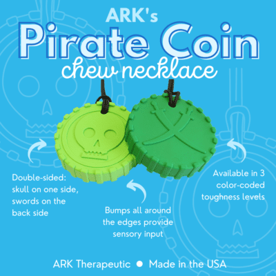 Ahoy maatjes! De ARK’s Pirate Coin kauwketting is een super stoere ketting voor kinderen met de behoefte ergens op te kauwen. De Pirate Coin is dubbelzijdig te gebruiken met op de voorkant een schedel en aan de achterkant twee zwaarden. Rondom de ketting vind je ribbels voor extra mondelingen input. De Pirate Coin is ongeveer 5 cm diameter en 1 cm dik. Gebruik hem als veilig alternatief voor het kauwen op potloden, shirts, vingers, enz. En om je te helpen met kalmeren, concentreren en spanningen te reguleren.