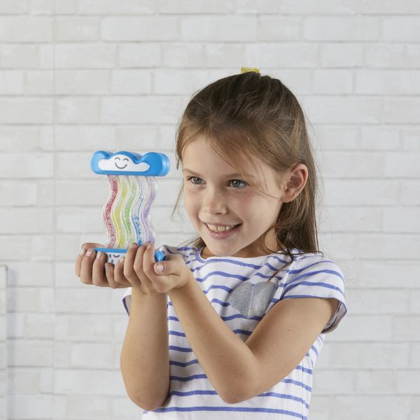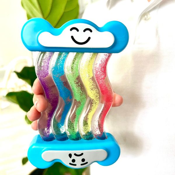 De My Feelings Rainbow Fidget is meer dan alleen een kleurrijk speeltje – het is een visueel hulpmiddel dat kinderen helpt hun gevoelens te begrijpen. Aan de ene kant stroomt een rustige regenboog uit een vrolijke wolk, aan de andere kant druppelt de kleur uit een verdrietige wolk. Dit contrast maakt emoties als blij en verdrietig meteen herkenbaar en bespreekbaar. Terwijl kinderen gefascineerd kijken naar de vloeiende kleuren, komen ze vanzelf tot rust.