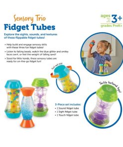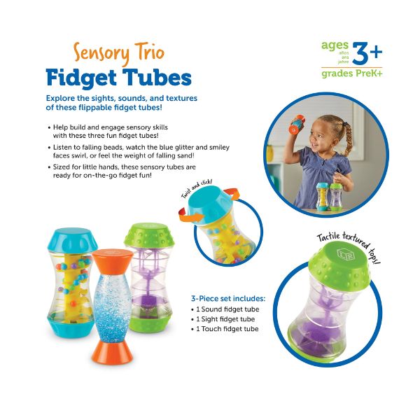Ontdek de Sensory Trio Fidget Tubes. Set van 3 buizen met zand, glitter en kraaltjes voor rustgevend sensorisch spel, emotie-regulatie en concentratie. Duurzaam & veilig!